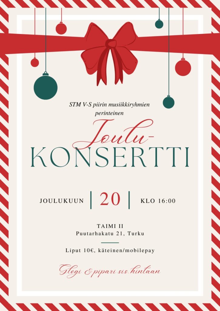 - Joulu tulla jollottaa joulupuuron porinassa, hyvän mielen hyrinässä, piparkakku kainalossa! STM:n Varsinais-Suomen piirin joulukonsertti on 20.12.2025 klo 16.00 Taimi II:ssa, Puutarhakatu 21.