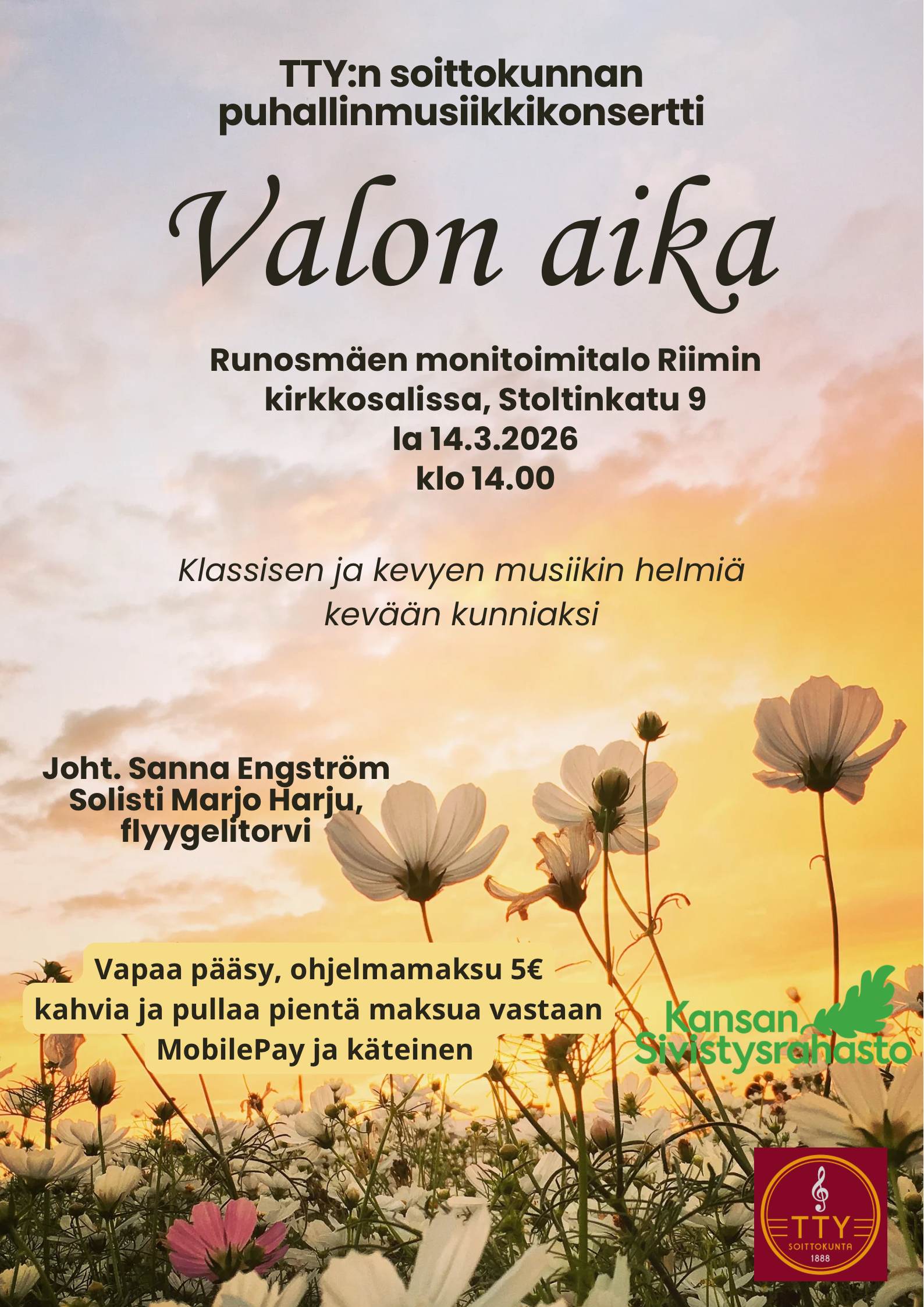 - Kevätkonsertti on la 14.3.2026 klo 14.00 Runosmäen monitoimitalo Riimin kirkkosalissa, Stoltinkatu 9. Lämpimästi tervetuloa! Luvassa on klassisen ja kevyen musiikin helmiä kevään kunniaksi.
